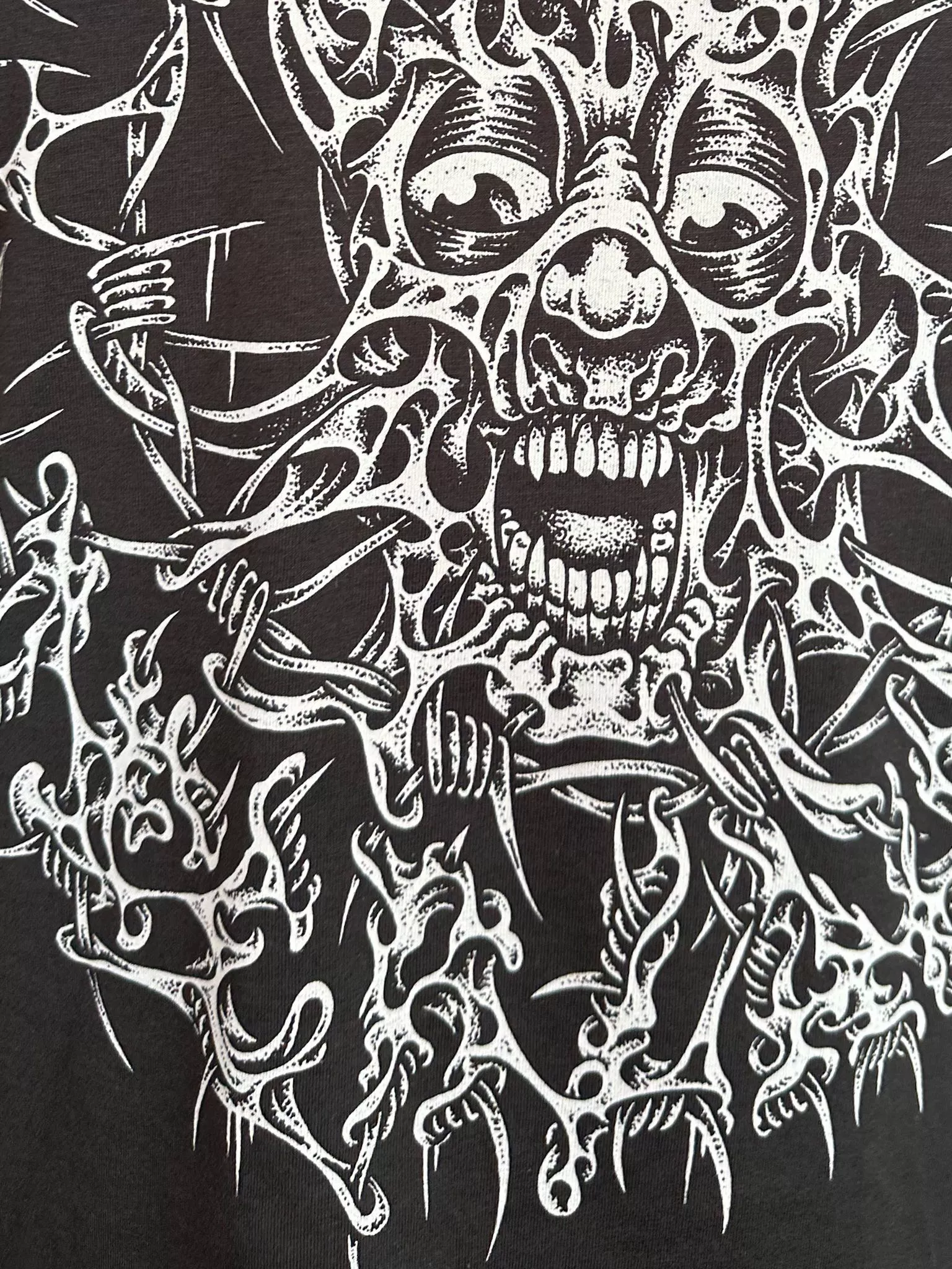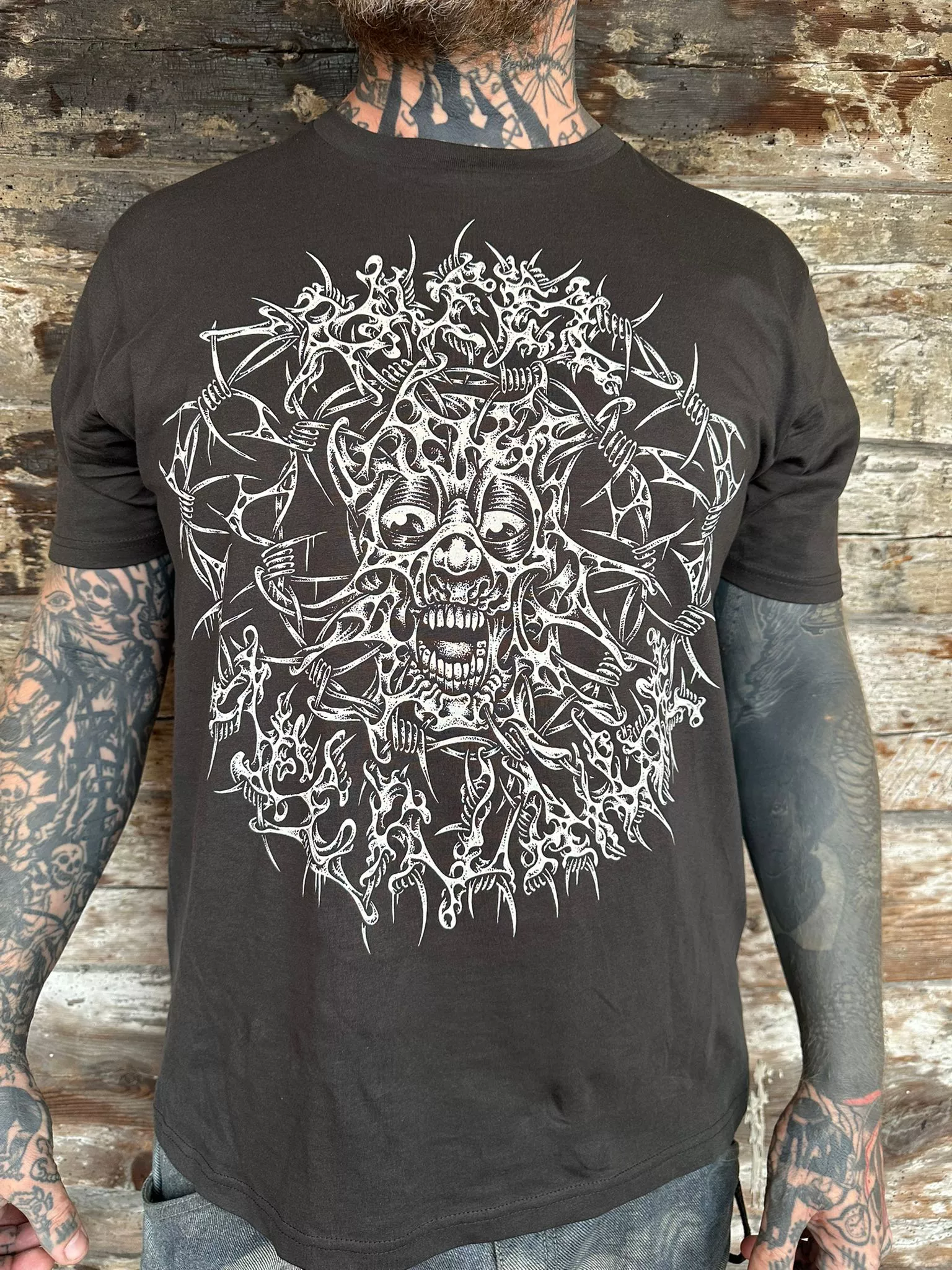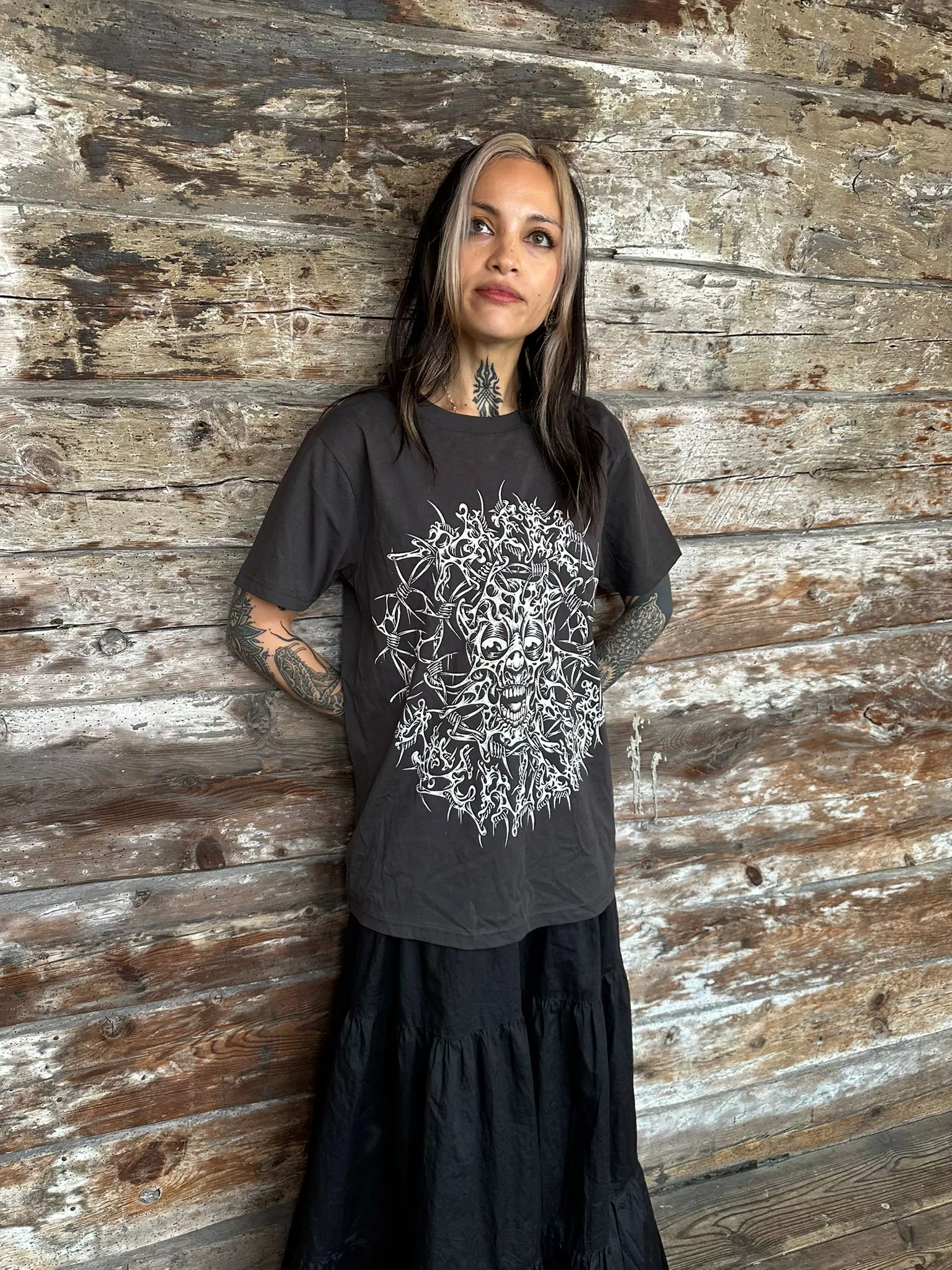 2 discharge prints on Ash black continental earth positive t-shirt